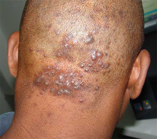 Las lesiones se manifiestan inicialmente como pápulas y pústulas foliculares, algo pruriginosas en la zona del cuello y cuero cabelludo occipital. Con el tiempo se desarrollan lesiones cicatriciales hipertróficas, y en casos más severos pueden ser dolorosas y realmente desfigurantes.