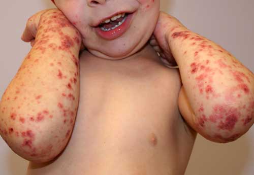 La púrpura típicamente aparece en las piernas y nalgas, pero puede llegar a verse también en los brazos, cara y tronco.