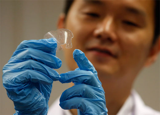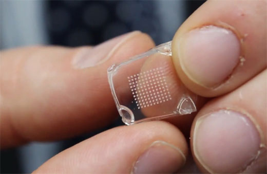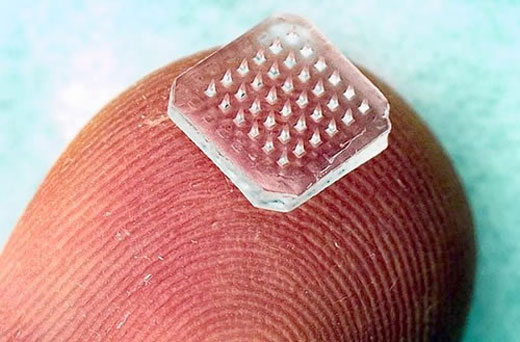 Una de cada 10 personas tiene miedo a las agujas hipodérmicas, un instrumento médico necesario pero incómodo. El profesor Ryan Donnelly y su quipo creen que han encontrado la solución. No una aguja, sino 361. El instrumento tiene la apariencia de un parche pequeño de plástico de medio centímetro que se sostiene fácilmente en la yema de los dedos.