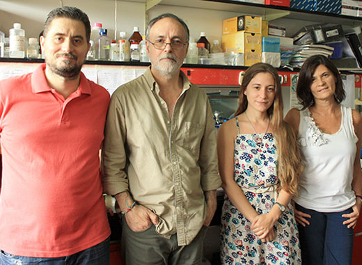 Los investigadores del Instituto Leloir que participaron del avance: la líder del estudio, doctora Laura Morelli (der.), la primera autora del trabajo, licenciada Pamela Martino Adami, el jefe del Laboratorio de Amiloidosis y Neurodegeneración, doctor Eduardo Castaño, y el segundo autor, doctor Pablo Galeano.